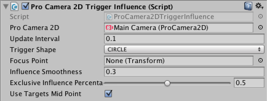 Update Interval(>0): For performance reasons the trigger collision is only tested at a fixed interval. This value represents that interval. Adjust it to fit your needsTrigger Shape: Either a circle or a rectangle. You can scale it like you do any other GameObjectFocus Point: The transform of the focus point. If left empty the focus point will be the center of the triggerInfluence Smoothness(>0): Represents how smoothly the camera should move towards the focus point. The lower the number the quickest the camera movesExclusive Influence Percentage: Represents a percentage of the trigger size that counts as the center of the trigger. Once the camera target enters this area it’s fully centred on the focus pointUse Targets Mid Point: If enabled, the trigger will use the camera targets mid point to know when to activate. If disabled, you can pass it a GameObject reference that the trigger will use instead
